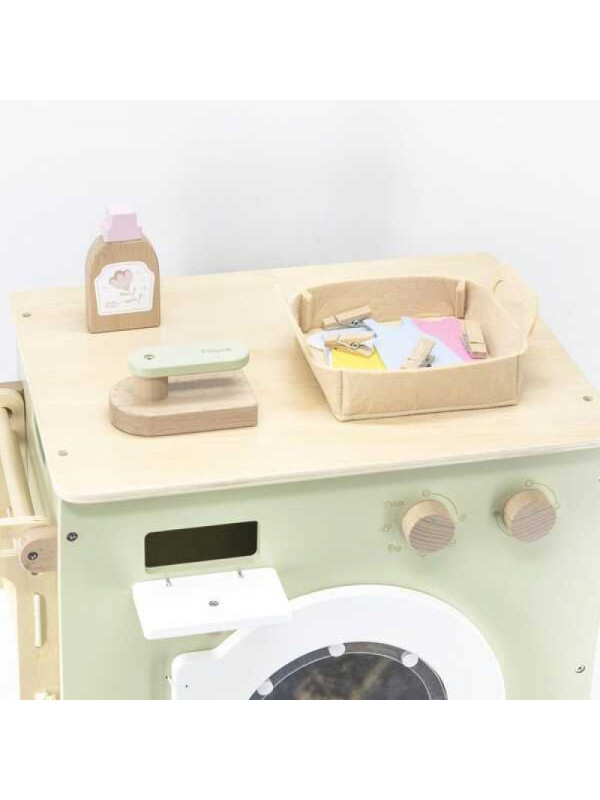 Drewniana pralka została zaprojektowana tak, aby jak najbardziej przypominać prawdziwe urządzenie. Dzieci mogą cieszyć się autentycznym doświadczeniem prania, suszenia, składania i prasowania ubranek, co pozwala im naśladować działanie prawdziwych pralek i sprzętów domowych.