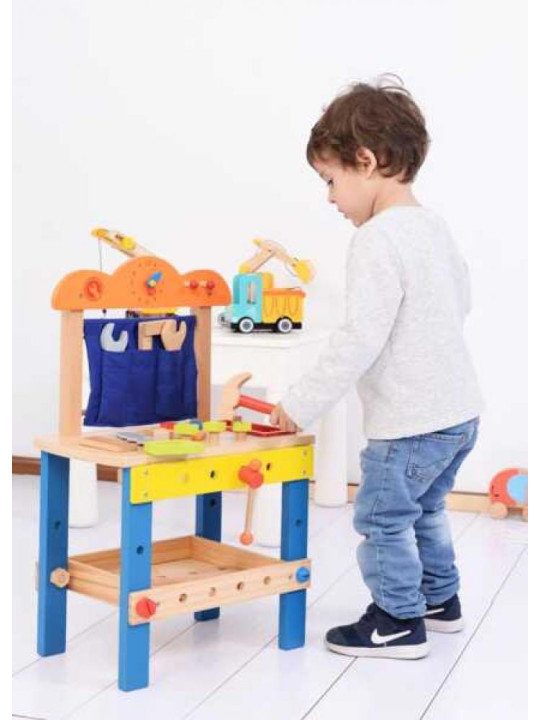 Prezentujemy warsztat małego majsterkowicza - drewniany, kolorowy zestaw z dużą ilością narzędzi. To idealne rozwiązanie dla dzieci, które uwielbiają majsterkowanie, skręcanie, uderzanie młotkiem i wykonywanie różnego rodzaju napraw.