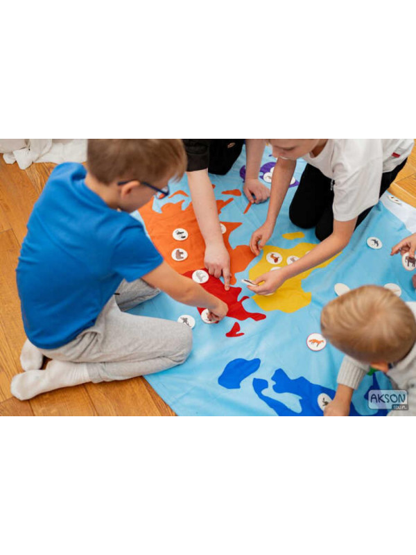 Chusta Edukacyjna mapa świata Nauka nigdy nie była taka prosta! Odkryj nowe możliwości edukacyjne z Chustą Edukacyjną Mapa Świata AKSON–doskonałym narzędziem łączącym zabawę z nauką. Ta wytrzymała i bezpieczna chusta edukacyjna to nie tylko mapa świata w żywych kolorach, ale także interaktywne narzędzie wspierające rozwój koordynacji wzrokowo-ruchowej oraz umiejętności refleksu i spostrzegawczości. Barwna mapa świata przyciąga wzrok i rozbudza ciekawość wszystkich uczestników zabawy. Nasza chusta edukacyjna mapa świata to wyjątkowe narzędzie, łączące edukację z zabawą. Chusta w kształcie elipsy, obszyta jest wytrzymałą taśmą nośną i posiada 12 wzmacnianych uchwytów, które rozszerzają możliwości animacji i zabaw. Może być używana jako mata rozłożona ziemi, jak i typowa chusta animacyjna. Dzięki uchwytom łatwo trzymać chustę w dłoniach lub przymocować matę do podłoża, a dodatkowe wzmocnienie materiałem zwiększa jej trwałość. Dodatkowe elementy, takie jak zestawy edukacyjne do chusty: zwierzęta, zabytki i flagi, wykonane są z trwałego tworzywa z rzepem. To interaktywne dodatki, które umożliwiają dowolne przypinanie i odpinanie w różnych miejscach, dostosowując się do indywidualnych potrzeb edukacyjnych. Elementy obramowania na dodatkach edukacyjnych posiadają barwy zgodne z kolorami odpowiadającymi poszczególnym kontynentom, co sprawia, że proces nauki przez zabawę staje się jeszcze bardziej przyjemny! Dzięki Kreatywnej Chuście AKSON, poszerzysz zakres swoich zajęć i animacji, przenosząc uczestników w świat wyobraźni. Ograniczeniem jest tylko Twoja kreatywność! Daj się ponieść twórczej zabawie! Chusta Edukacyjna Mapa Świata AKSON to rewelacyjne narzędzie do rozwijania umiejętności i urozmaicania procesu nauki. Pozwól się zabrać w fascynującą podróż po świecie, odkrywając go w sposób pełen interakcji! Nasze Chusty Edukacyjne, dostępne w różnych zestawach, zostały stworzone z myślą o zaspokojeniu zróżnicowanych potrzeb. Bez względu na to, czy szukasz narzędzia edukacyjnego dla najmłodszych czy bardziej zaawansowanego zestawu dla starszych uczniów, znajdziesz u nas rozwiązania dopasowane do różnych grup wiekowych i wymagań edukacyjnych. Parametry: wymiary: elipsa 120 x 160 cm materiał: 100% poliester gramatura materiału: 190 g/m2 kolorystyka: fioletowy, niebieski, zielony, żółty, pomarańczowy, czerwony ilość uchwytów: 12 odległość między uchwytami: 19 cm pokrowiec: TAK wymiary w opakowaniu: 25 x 35 x 8 cm waga produktu: 860 g Instrukcja prania:
