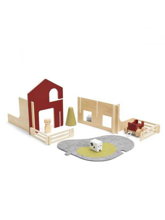 Świat zabawy Farma firmy Micki zawiera: 4 ściany, 1 figurkę, 2 zwierzątka, 4 ogrodzenia, 1 drzewo, 1 przyczepkę, 5 magnesów (słońce, kwiat, widły, kupa i wiadro) oraz dwuczęściową matę do zabawy z filcu.