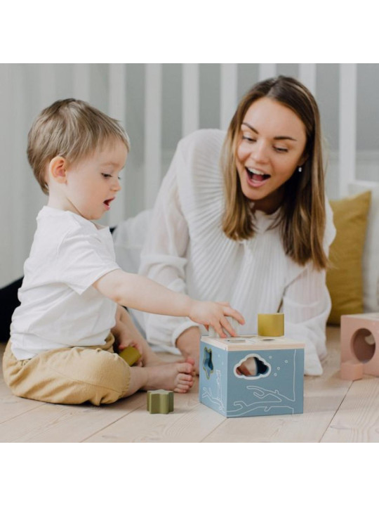 Odpowiedni kształt w odpowiednim otworze! Klasyczna drewniana zabawka Micki - sorter kształtów, inspiruje do nauki i zabawy. Otwory w drewnianej zabawce pasują do kształtu i koloru drewnianych klocków, więc dziecko wie, który klocek pasuje. Gdy klocki są w pudełku, wystarczy wsunąć rękę w otwór, aby je wyjąć i zacząć od nowa! Dno pudełka jest pokryte filcem, aby dawało przyjemny dźwięk, gdy klocki są wrzucane. Sorter kształtów zawiera sześć drewnianych klocków o różnych kształtach.