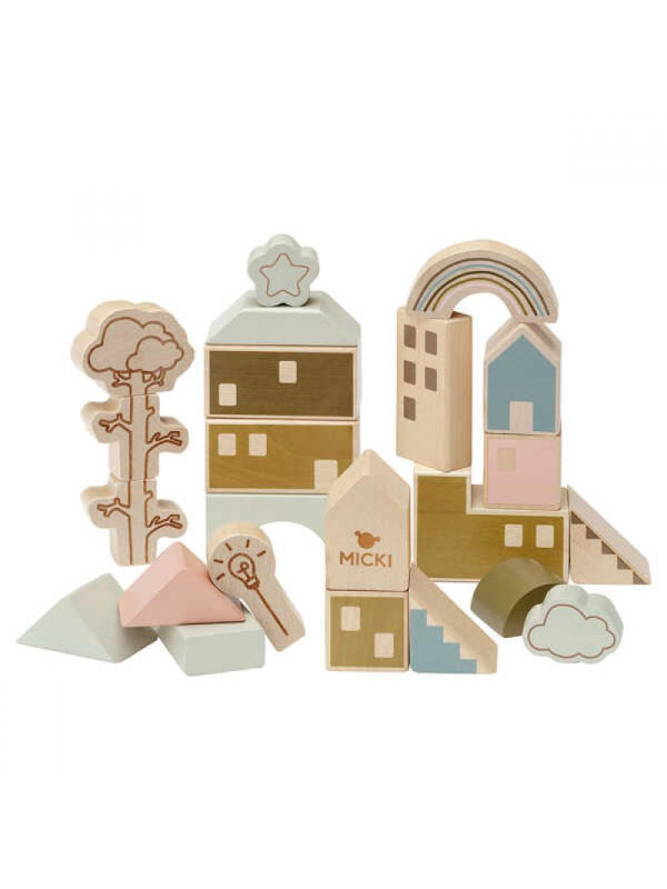 Buduj, odkrywaj i baw się drewnianymi klockami Micki z linii Premium! Dwadzieścia trzy drewniane klocki w formie budynków o różnych kolorach to klasyczne zabawki, które nie tylko pobudzają wyobraźnię dziecka, ale także rozwijają zdolność koordynacji. Różnorodne kształty i kolory z ilustracjami, które zachęcają do zabawy i odkrywania! Czym zaskoczy nasze dziecko dzisiaj? Może zbuduje miasto dla swoich lalek, stajnię dla jednorożca, a może magiczną wieżę? Wyobraźnia i ciekawość dzieci mają pełną swobodę! Te klocki doskonale pasują do zestawu kolejki Micki.