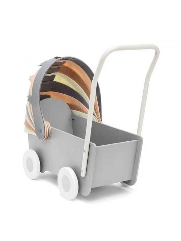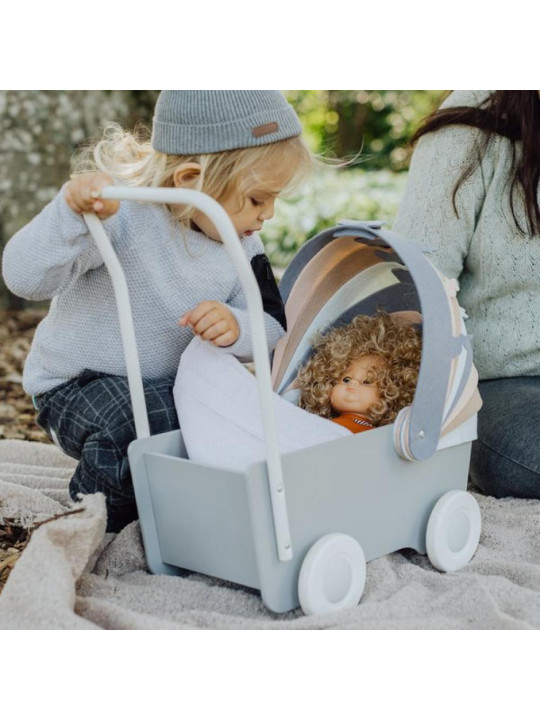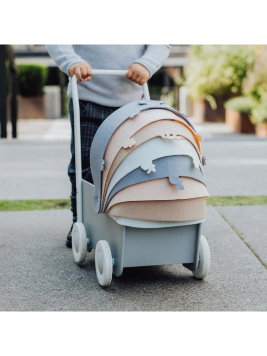 Drewniany wózek dla lalki szary z filcowym, składanym daszkiem Skrallan