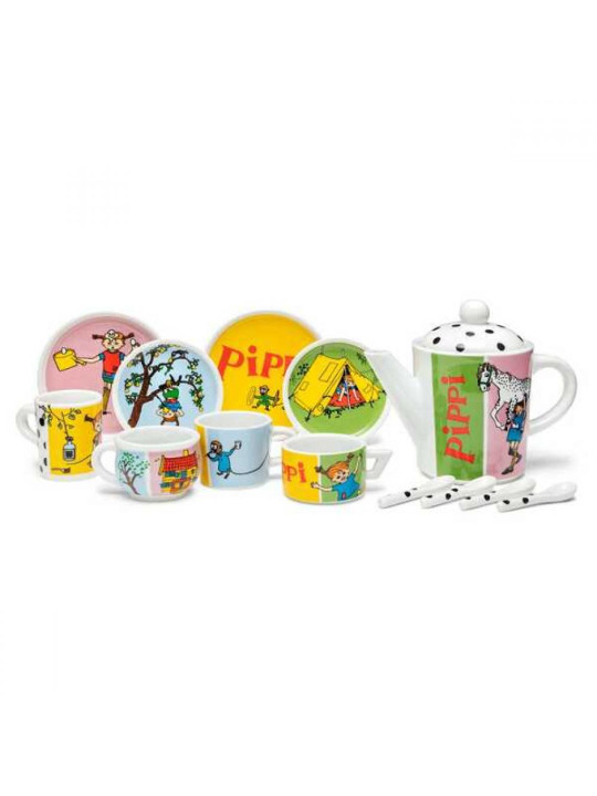 Ten zestaw naczyń dla lalek zawiera: cztery filiżanki w różnych wzorach, rozmiarach i kształtach, cztery spodki w różnych wzorach i dwóch różnych rozmiarach, cztery łyżeczki oraz dzbanek na herbatę z przykrywką. Wszystkie eleemnty zestawu ozdobione są różnymi ilustracjami Pippi. Jest to 14-elementowy zestaw naczyń dla lalek wykonany z porcelany, który można myć w zmywarce.