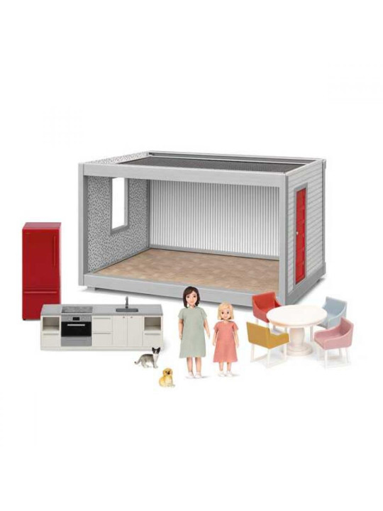 Zestaw zawiera w pełni umeblowany domek dla lalek Lundby o wymiarach 33 cm, podstawowy zestaw stołowy Lundby, podstawowy zestaw kuchenny Lundby i dwie urocze lalki.