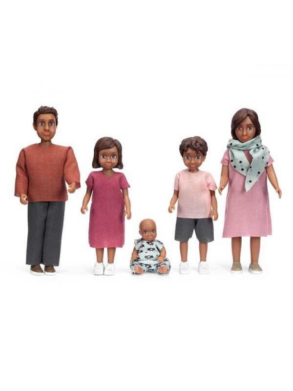 Zestaw lalek od Lundby z pięcioma różnymi lalkami, dwoma dorosłymi i trójką dzieci (w tym małym niemowlęciem).