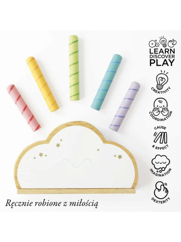 Ta gra w kształcie tęczowej chmurki to klasyczna zabawa. Małe dzieci pokochają interaktywną, sprężynową drewnianą zabawkę, która posiada pięć kolorowych tęczowych patyczków wyskakujących w trzech różnych wysokościach.