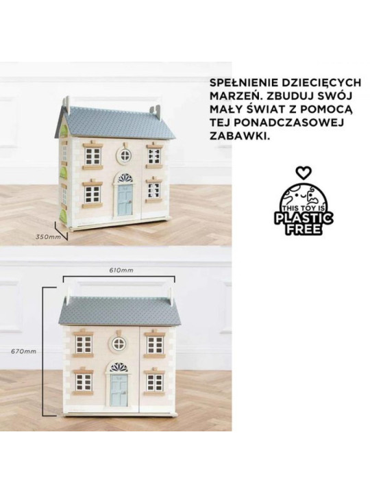 Zachęcaj do kreatywnej zabawy w małym świecie dzięki temu wyjątkowemu, ponadczasowemu domkowi. Został wykonany ze zrównoważonego drewna certyfikowanego przez FSC™ i pomalowany w pięknych pastelowych odcieniach różu, bieli i szarości przy użyciu nietoksycznych farb na bazie wody. Luksusowy domek drewniany  o trzech piętrach.