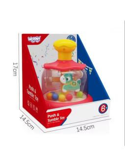 Przeznaczona dla dzieci od 6 miesiąca życia, karuzela wykonana jest z bezpiecznych i trwałych materiałów. Zabawka posiada przyjazną estetykę, która przyciąga uwagę maluchów, wspierając jednocześnie ich rozwój sensoryczny. Aby uruchomić karuzelę, wystarczy, że dziecko naciśnie żółtą górną część, a konik i kulki zaczną wirować, wprowadzając w ruch całą zabawkę.