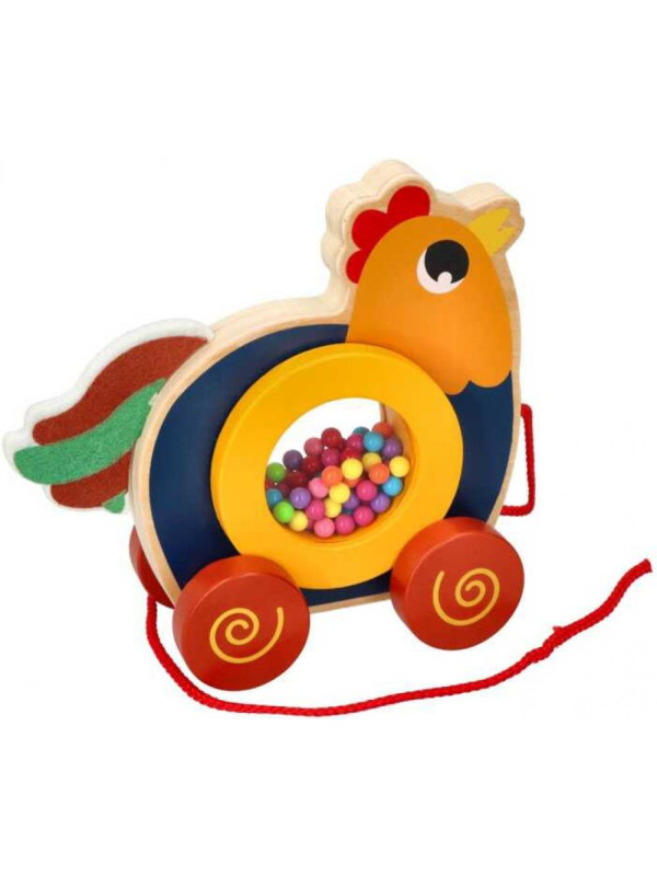 Kogucik przyciąga uwagę dziecka swoimi przyjaznymi, wesołymi kolorami oraz uroczym wyglądem. W środku znajduje się otwór z wieloma kolorowymi kuleczkami, które wprawione w ruch wirują podczas ciągnięcia zabawki na spacerze. Im szybsze tempo marszu, tym szybciej obracają się kuleczki, co stanowi dodatkowy bodziec dla malucha do aktywności.