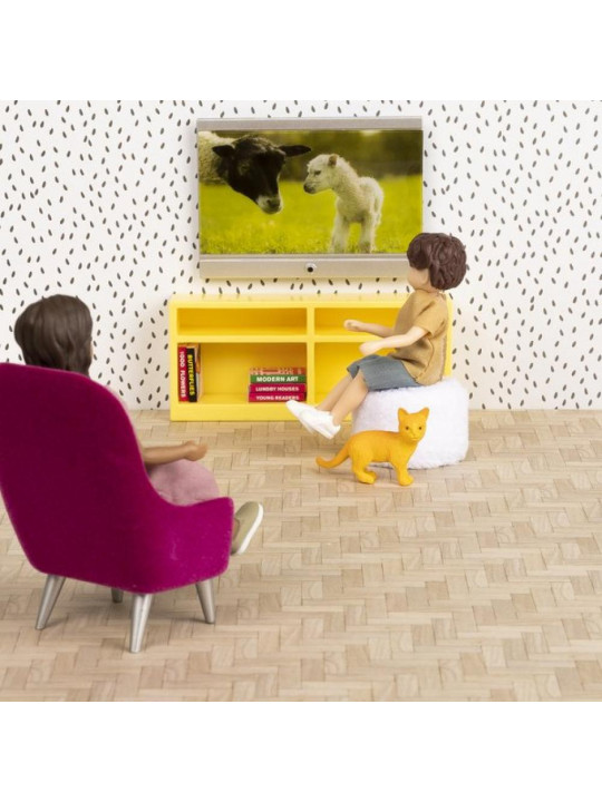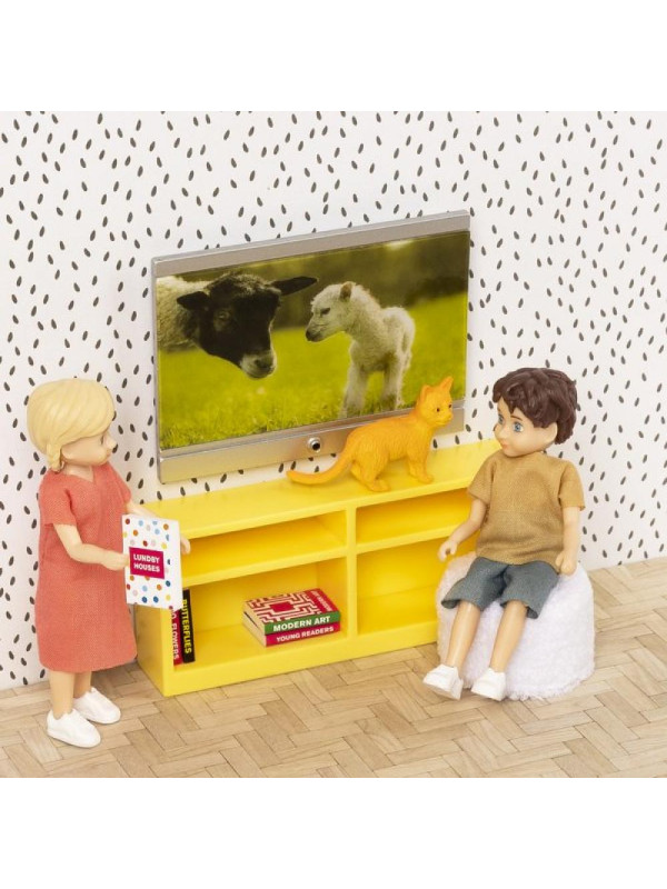Zestaw akcesoriów telewizyjnych dla rodziny Lundby! Nowoczesny telewizor z płaskim ekranem na ścianie uzupełnia półka na książki, idealna, gdy członkowie rodziny domków dla lalek chcą spędzić trochę czasu relaksując się razem. Zestaw zawiera również pufę, kota i siedem uroczych książek.