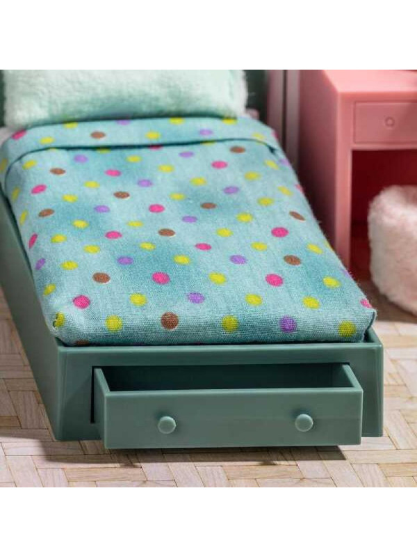 Fajne łóżko, taboret i biurko dla nastolatka z rodziny Lundby. Na biurku jest komputer gotowy do gier lub rozmów z przyjaciółmi! Kiedy robi się ciemno, naturalnie włączasz małe lampki zasilane baterią, aby oświetlić swój domek dla lalek. Lampa wyłącza się automatycznie po 15 minutach. Łóżko ma tapicerowany zagłówek, szufladę na przechowywanie i miękką, przytulną kołdrę. Zestaw zawiera także miękką pufę i tablicę.