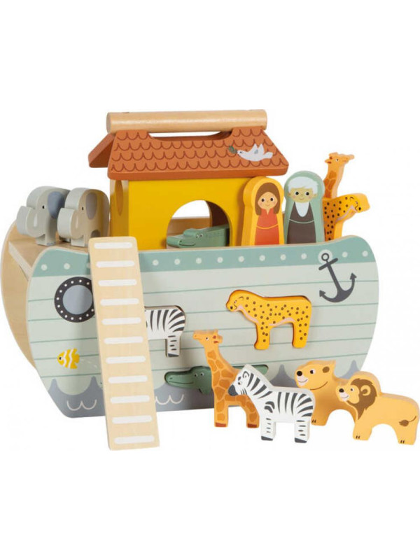 Go on the great adventure of Noah's Ark! This shape-fitting boat in the form of Noah's Ark is not just a shape-fitting game – it's also a fascinating playtime world that brings variety-rich, long-lasting playtime and learning fun. The shape-fitting game has 15 wooden figurines that are easy to grasp for children's hands and include 6 pairs of animals, 2 human figurines, and a ladder. All of the animal figurines fit perfectly in the ship's opening and help train motor skills when kids put them through the openings. With its removable lid with a child-friendly handle, the shape-fitting ship can be easily opened to take the wooden figurines back out again.