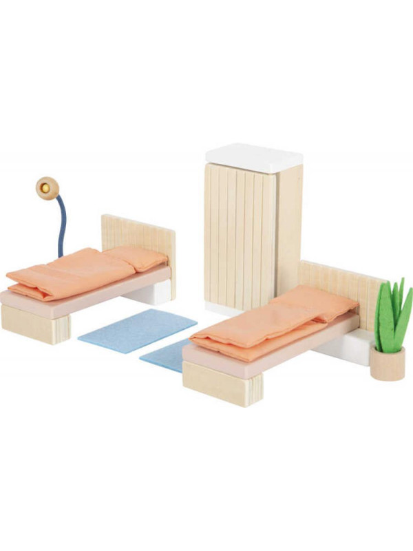 A cozy retreat for dreaming and relaxing! This doll house furniture set offers a cosy atmosphere for the doll family in their bedroom. There are two beds in the center of the set which can be used as one twin bed or as single beds. This flexibility allows the bedroom to be designed however you want. Two soft pillows and blankets provide comfort for the dolls. The stylish wardrobe offers realistic playtime fun with its trim and integrated mirror. An elegant arch lamp brings "light" into the doll house bedroom and creates a pleasant atmosphere. Two rugs provide even more comfort and give the bedroom a homely vibe as a space. A small green plant completes the set and brings a bit of nature into the doll house.