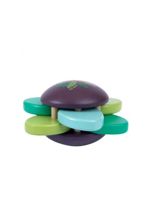 Ta drewniana grzechotka charakteryzuje się pięknymi zielonymi listkami, które otaczają środek zabawki, w którym ukryty jest dzwonek, emitujący przyjemne dźwięki. Centralnym elementem jest motyw bzyczącej pszczółki, który z pewnością przyciągnie uwagę każdego malucha.