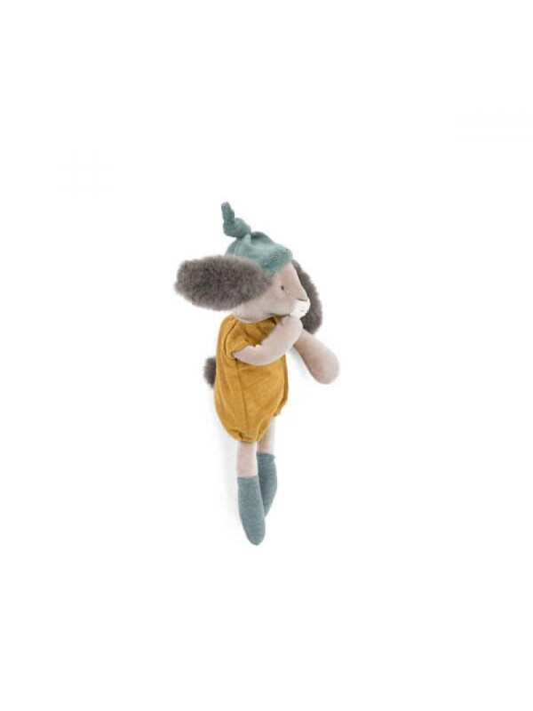 Króliczek ubrany jest w musztardowy rampers, który nadaje mu odrobinę vintage'owego klimatu. Zielone buciki i urocza czapka zawiązana na supeł, z której wystają długie futrzane uszy, nadają mu niepowtarzalnego charakteru. Te detale sprawiają, że króliczek jest nie tylko zabawką, ale również pięknym elementem dekoracyjnym w dziecięcym pokoju. Produkty Moulin Roty są znane z wyjątkowej jakości i dbałości o szczegóły, co przekłada się na trwałość i estetykę maskotek.