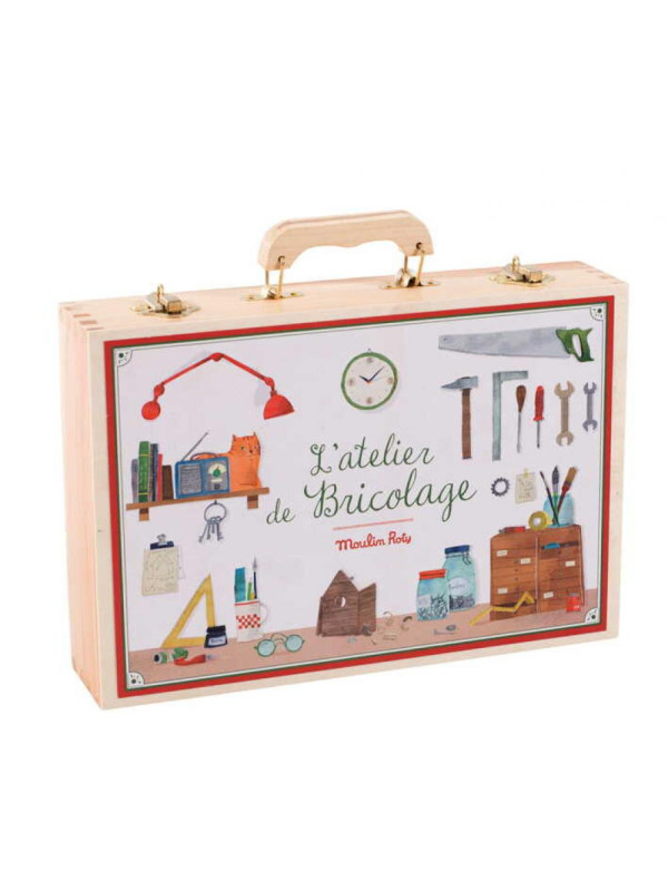 Zestaw narzędzi w skrzynce „L'atelier de Bricolage” to idealna zabawka dla dzieci, które pragną rozwijać swoje umiejętności manualne oraz kreatywność. W eleganckiej, drewnianej walizce w stylu retro o wymiarach 32 x 22 cm znajduje się 14 elementów, które umożliwiają różnorodne zabawy konstrukcyjne.