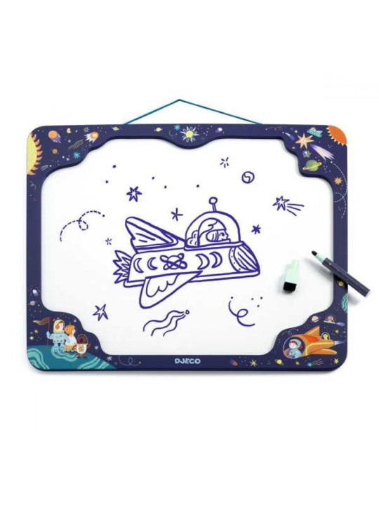 Magnetyczna tablica suchościeralna umożliwia zapisywanie notatek, rysowanie oraz wieszanie zdjęć. Wyposażona w ozdobną drewnianą ramkę z kolorowymi motywami kosmicznymi, wprowadza elementy edukacyjne i estetyczne do każdego pokoju.