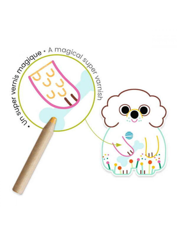 Zestaw zawiera 12 szablonów w kształcie zwierzątek, które można pokolorować za pomocą grubej kredki, doskonałej dla małych rączek. Dzięki specjalnym polom, które ujawniają się podczas kolorowania, dzieci odkrywają różnorodne wzory i niespodzianki. To prawdziwie magiczne kolorowanki, ponieważ kredka koloruje tylko wybrane obszary, prezentując piękne wzory.