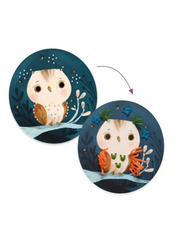 Zestaw zawiera karty z ilustracjami leśnych zwierzątek, takich jak wiewiórka, sowa, jeż oraz borsuk. Każda z kart jest perforowana, co ułatwia przewlekanie włóczki za pomocą dołączonej plastikowej igły. Kolorowa włóczka, użyta w różnorodny sposób, nadaje obrazkom głębi i ożywia ilustracje.