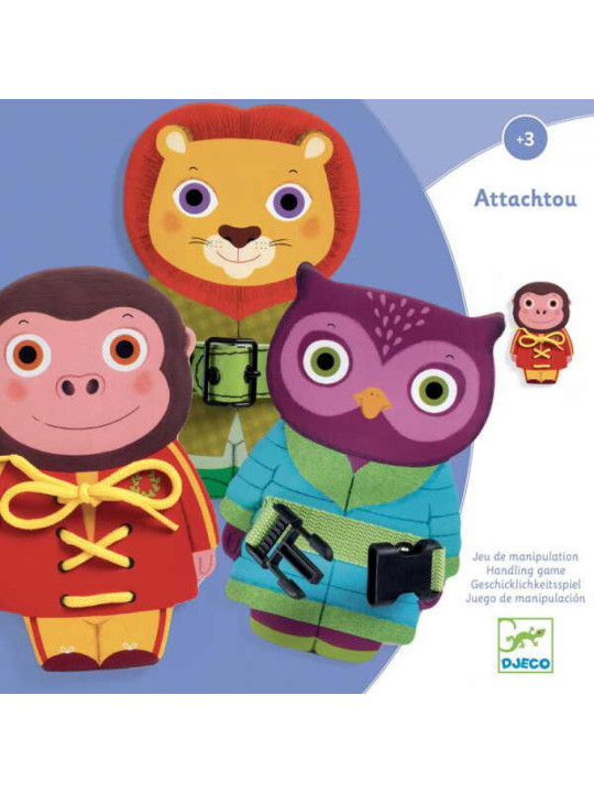 Drewniane zwierzaki manualne ATTACHTOU to oryginalna drewniana zabawka, która zawiera trzy urocze postacie: małpkę, sowę i lwa, ubrane w różnokolorowe kurtki.