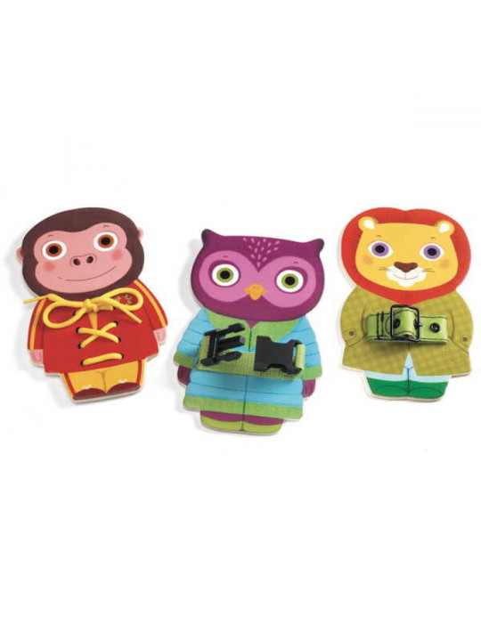 Każda z figurek ma na sobie kurtkę, którą dziecko może rozpinać i zapinać za pomocą różnych akcesoriów: plastikowego klipsa, metalowej klamry lub sznureczków. Zabawa tymi elementami sprawia dzieciom ogromną frajdę, a równocześnie ma wartość edukacyjną. Kolorowe postacie zachęcają każde dziecko do zabawy, jednocześnie ucząc je manipulacji małymi przedmiotami oraz rozwijając ich umiejętności motoryczne.
