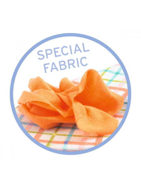 Zestaw zawiera ubrania wykonane z innowacyjnej tkaniny, która rzeczywiście prostuje się pod naciskiem drewnianego żelazka, dając wyjątkowy efekt magicznego prasowania: wszystkie zagięcia znikają. Po skończonej zabawie ubrania można ponownie pognieść i rozpocząć zabawę od nowa.