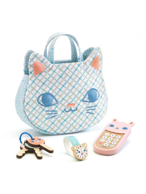 Urocza, niebieska torebka w kształcie głowy kotka to doskonały pomysł na zabawkę, która zapewni dzieciom wiele godzin kreatywnej zabawy. Cudownie wyszywana z obu stron, z jednej strony kotek ma otwarte oczy, a z drugiej zamknięte, co dodaje jej wyjątkowego uroku. Wewnątrz torebki znajdują się akcesoria, które pozwalają dzieciom na zabawę w „dorosłych”: zegarek na rękę z elastycznym paskiem, drewniany telefon w etui w kształcie różowego króliczka oraz komplet kluczy z motywem różnych zwierzątek.