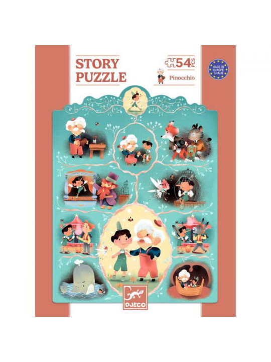 Puzzle zostały zaprojektowane przez renomowaną firmę Djeco i ukazują przygody drewnianego chłopca Pinokia oraz jego ojca Gepetta w formie przepięknych ilustracji. Po ułożeniu układanka ma wymiary 38 x 50 cm. Elementy wykonane są z trwałego kartonu, co zapewnia ich długotrwałość i odporność na uszkodzenia.