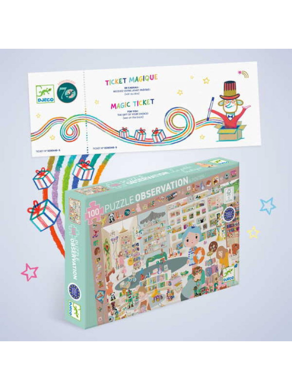 Po ułożeniu puzzli obrazek przedstawia pięknie ilustrowany sklepik z zabawkami, który zawiera wiele kultowych produktów, które powstały w ciągu lat działalności Djeco. Układanka oferuje zabawę typu 2 w 1: układanie puzzli oraz poszukiwanie przedmiotów przedstawionych na obrazku.