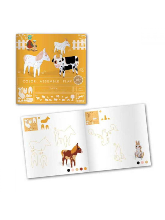 W zestawie znajduje się 16 wstępnie wyciętych zwierzątek i elementów do samodzielnego montażu, bez użycia kleju i nożyczek. Pozwala to na bezpieczną i łatwą zabawę. Zwierzątka i elementy są przeznaczone do samodzielnego kolorowania, co dodatkowo stymuluje kreatywność dziecka.