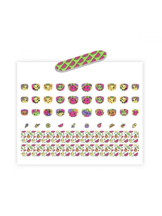 Naklejki ozdobione są uśmiechniętymi owocami w neonowych kolorach, które nie tylko pięknie wyglądają, ale także zapewniają trwały efekt, wytrzymujący około tygodnia.