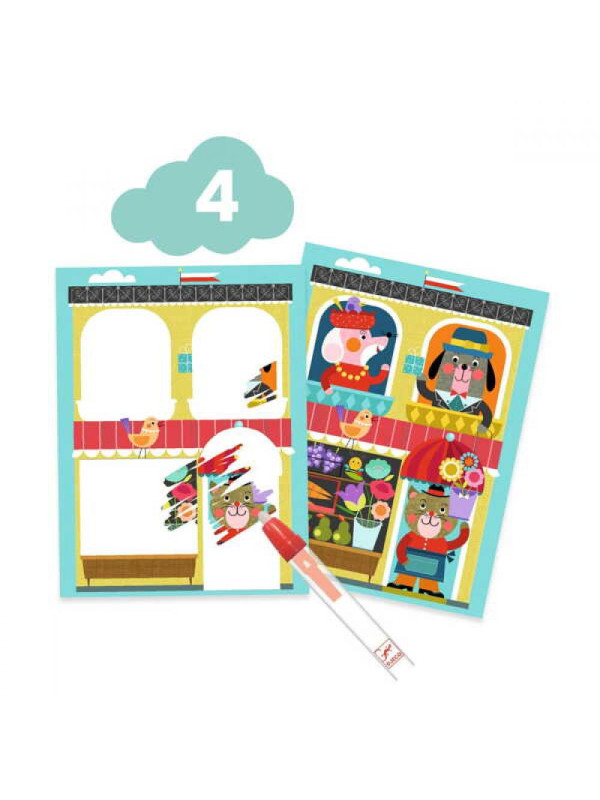 • Kolorowanie z szablonem: 4 ilustrowane karty, 1 szablon z otworami, 4 kredki.