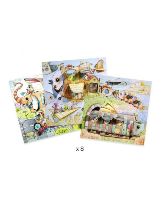 W zestawie znajdują się dwie serie po cztery podwójne karty, co łącznie daje osiem kart do pokolorowania z otwieranymi okienkami. Wszystkie elementy wykonane są z papieru i kartonu posiadającego certyfikat FSC®, co gwarantuje, że produkt jest przyjazny dla środowiska.