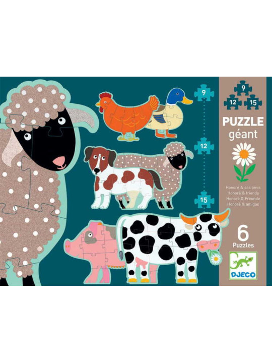 Przedstawiamy tekturowe puzzle gigantyczne "HONORÉ I PRZYJACIELE". To doskonała zabawka edukacyjna dla dzieci, która składa się z 6 uroczych zwierzątek do układania. Każda układanka zawiera od 9 do 15 elementów, co pozwala na różnorodność i dostosowanie trudności do wieku dziecka.