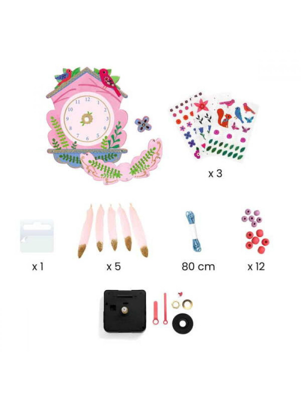 Zestaw oferuje możliwość kalkowania ozdobnych elementów i przenoszenia ich na różne części zegara. Następnie dzieci mogą zawiesić kolorowe sznurki z koralikami i piórkami, co dodatkowo ubarwi ich nowo powstałe dzieło.