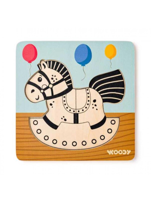 Układanka składa się z podstawy oraz pięciu elementów, z których dziecko może ułożyć obrazek przedstawiający uroczego konika na biegunach. Na tle widać trzy kolorowe balony, które dodają całości niezwykłego uroku.