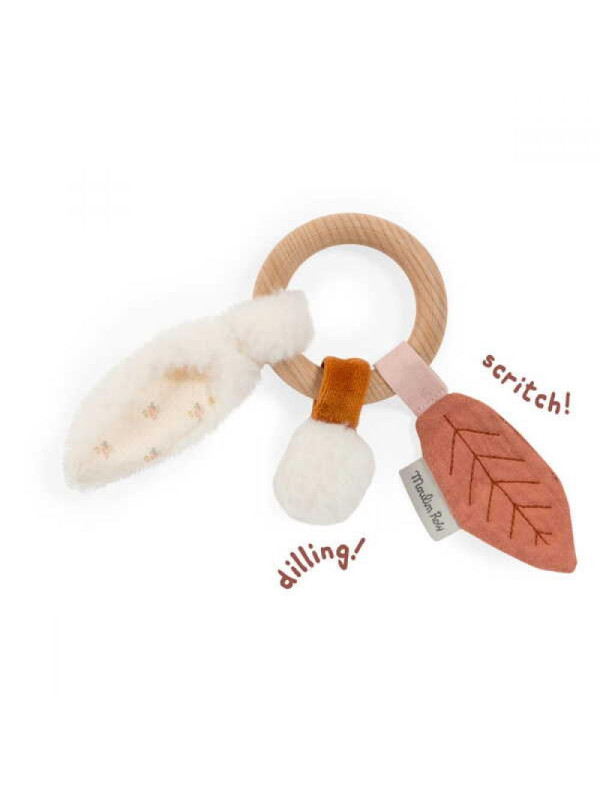 Grzechotka została zaprojektowana z myślą o rozwoju zmysłów dziecka. Delikatny dzwoneczek wewnątrz produktu cicho brzęczy przy potrząsaniu, a obecność szeleszczącego papieru w liściu dodaje dodatkowego wrażenia dotykowego i dźwiękowego.