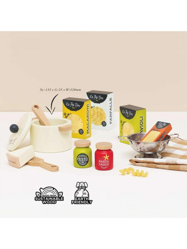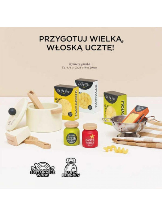 Elementy zestawu bardzo realistycznie odzwierciedlają prawdziwe akcesoria i produkty spożywcze, dzięki czemu mały szef kuchni będzie miał jeszcze więcej inspiracji do długiej i kreatywnej zabawy w gotowanie. Ta 12-elementowa zabawka zawiera wszystko, czego potrzebuje Twoje dziecko, aby zaskoczyć Cię przepysznym, iście włoskim posiłkiem: rondel, metalowy durszlak, tarka do sera, parmezan, drewniana łyżka, opakowania makaronu w różnych kształtach, pesto i sos pomidorowy.