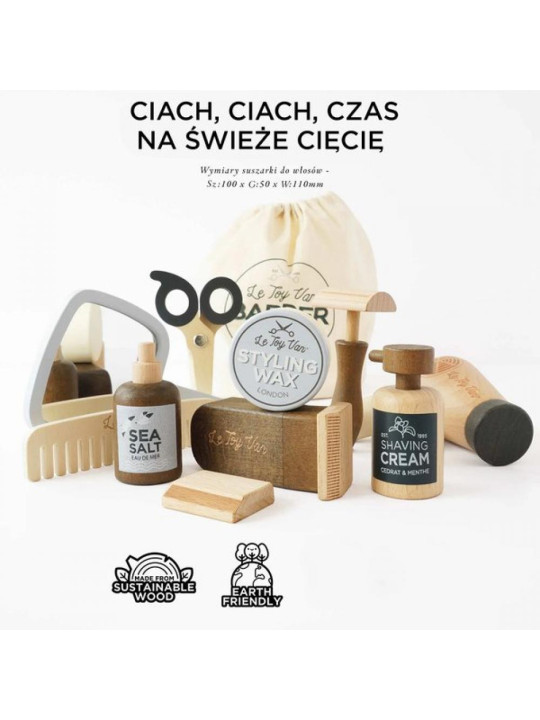 Ten zestaw jest idealny dla miłośników fryzjerstwa. Promuje interakcję społeczną poprzez kreatywną zabawę, rozwija umiejętności motoryczne i zręczność, uczy poprzez doświadczanie. Składa się z bawełnianego woreczka w stylu vintage, który zawiera: pięknie wykonany klasyczny grzebień, profesjonalną suszarkę do włosów, nożyczki, lusterko, maszynkę do strzyżenia z wymiennymi ostrzami (z ukrytymi magnesami), maszynkę do golenia w stylu vintage, piankę do golenia, wosk do stylizacji i spray z solą morską.