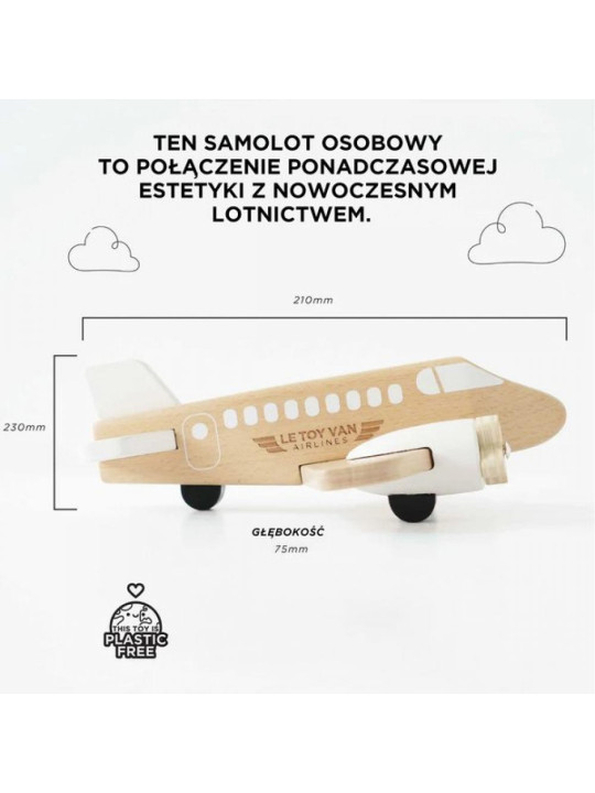 Wyposażony w obracające się śmigła, przepiękny i ponadczasowy model samolotu linii Le Toy Van Airlines zachwyca dzieci i dorosłych. Wykonany z drewna certyfikowanego FSC, ten samolot ma gładkie, bezpieczne dla dzieci krawędzie, dzięki czemu ukazuje piękno, naturalny przekrój i strukturę drewna. Ozdobiony grawerowanymi detalami i białymi akcentami uzyskanymi przy pomocy bezpiecznych dla maluchów farb na bazie wody, bez grama plastiku, stanowi wspaniałą zabawkę i fantastyczny element dekoracyjny każdego wnętrza.