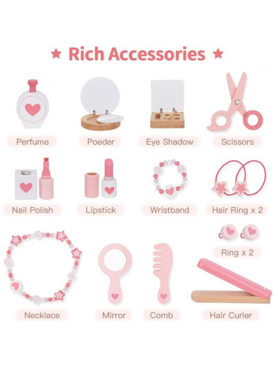 TOOKY TOY Drewniana Toaletka z Krzesełkiem Składane Lusterko Akcesoria 15 el.