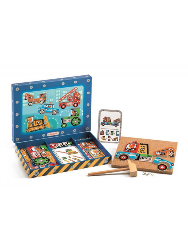 Zestaw zawiera elementy, które można przybić do korkowej tablicy za pomocą dołączonego młotka. Specjalnie zaprojektowane śruby umożliwiają łatwe mocowanie i zdejmowanie części, co pozwala na wielokrotne zabawy.