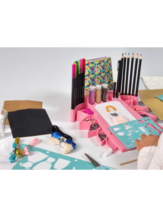 Ułóż arkusz z sylwetką na podkładce, następnie za pomocą szablonów dodaj fryzurę i narysuj strój.Nadaj strojom kształt i objętość dzięki licznym dodatkom. Kolorowe samoprzylepne tkaniny, pióra, cekiny, filc, wstążki, kredki akwarelowe sprawią, że Twoje postacie będą wyglądać jak projekty ubrań z prawdziwego domu mody! Zainspiruj się portfolio, aby stworzyć własne modne stroje!Przybornik zawiera 2 szufladki do przechowywania drobnych elementów jak cekiny czy guziki. W zestawie:- przybornik-baza do pracy i przechowywania wszystkich akcesoriów,- arkusze z konturami postaci, - 4 szablony do odrysowywania ze strojami, fryzurami i dodatkami,- samoprzylepne tkaniny,- pióra, wstążki, cekiny,- pojemniczki z brokatem,- flamastry dwustronne ( z jednej strony mają końcówkę w formie pędzelka do zamalowania większych powierzchni),- kredki akwarelowe,- nożyczki, temperówka, pędzelek,- instrukcja krok po kroku wraz z propozycjami strojów. Link do filmiku instruktażowego: https://youtu.be/xnC2jotovCc Wiek: +7 lat Wymiaty opakowania: 16,9x9,30x30,5 cm