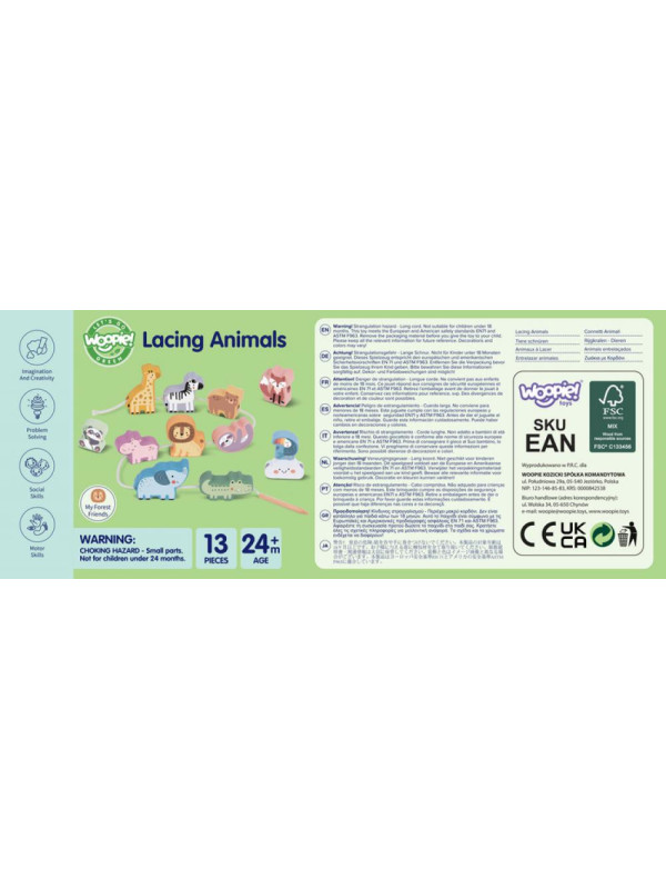 Klocki do nawlekania Zwierzątka ZOO marki WOOPIE GREEN stanowią doskonałą zabawkę wspierającą rozwój umiejętności motorycznych u dzieci. Zestaw zawiera pięć starannie wykonanych drewnianych zwierzątek: misia, lwa, krokodyla,żyrafe, leniwca, hipototama, słonika, pande, tukana oraz lisa. Każde zwierzątko ma specjalne otwory, przez które dziecko może nawlekać kolorowe sznureczki. Przeplatanka dla najmłodszych to klasyczny zestaw drewnianych elementów z dziurkami, przez które maluch może przeplatać sznureczek. Ta fascynująca zabawa nie tylko rozwija zręczność małych rączek, ale także pobudza ciekawość dziecka w zakresie zwierząt i otaczającego świata. Klocki w kształcie zwierzątek dodają elementu edukacyjnego, ucząc jednocześnie rozpoznawania różnych gatunków.Zabawka zachwyca swoją prostotą, ale to właśnie w niej kryje się siła. Dziecko może spędzać długie godziny, ćwicząc swoje zdolności manualne, a jednocześnie cieszyć się pięknymi kolorami i przyjaznymi postaciami zwierzątek. Naturalne, drewniane elementy są bezpieczne dla dziecka, a nietoksyczne farby i lakiery gwarantują bezpieczeństwo podczas zabawy. Dzięki WOOPIE GREEN, dzieci nie tylko świetnie się bawią, ale również uczą się cierpliwości, precyzji i kreatywnego myślenia.