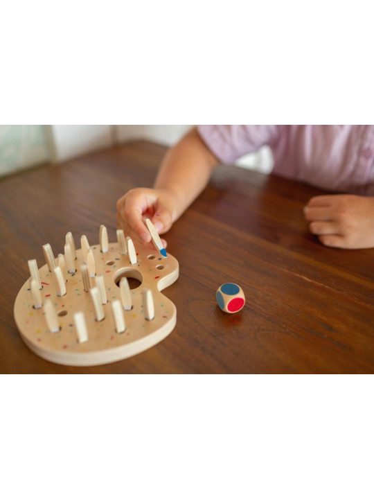 W zestawie znajdują się : drewniana paleta 15 x 15 cm, drewniana kostka do gry, 24 drewniane pędzle (4 cm).