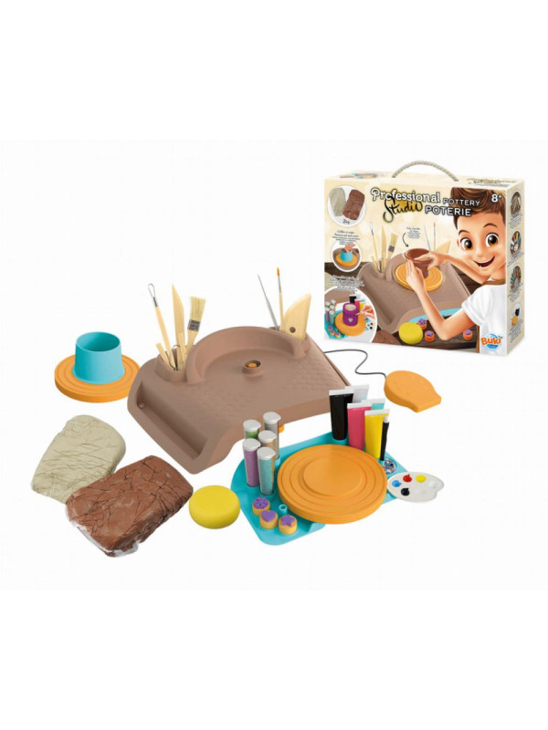 Prawdziwe koło garncarskie specjalnie przystosowane dla dzieci. Dziecko nauczy się jak wykonać miskę, kubek, czy talerz, które następnie będą mogły udekorować.Klucz do sukcesu? Foremka została specjalnie zaprojektowana do odmierzania potrzebnej ilości gliny i jej prawidłowego wyśrodkowania na kole, aby zapewnić udany początek tworzenia. Po wykonaniu projektu, wystarczy przenieść go razem z kołem na wysuwaną szufladę-przybornik i pozostawić na kilka dni do wyschnięcia. Następnie można go udekorować. W oczekiwaniu na wyschnięcie danego elementu można tworzyć nową rzecz, ponieważ zestaw zawiera drugie, zapasowe koło do pracy. Glina schnie na powietrzu. Latem suszenie trwa 2-3 dni, a zimą 3-5 dni. W zestawie:- baza z 2 żółtymi kołami garncarskimi,- wysuwana szuflada-przybornik do ozdabiania,- 1 kg białej gliny, - 1 kg brązowej gliny,- paleta malarska na farby,- 5 drewnianych i metalowych narzędzi do formowania,- 5 tubek z farbą 15 ml,- 2 pędzelki,- 5 tubek z brokatem,- stempelki, gąbka, cyrkonie,- silnik, pedał, kabel zasilający 1,70m z wtyczką EU,- instrukcja krok po kroku. Link do filmiku instruktażowego:https://www.youtube.com/watch?v=CHV9gV3tAuU Wiek: +8 lat Wymiary opakowania: 37x9x31 cm