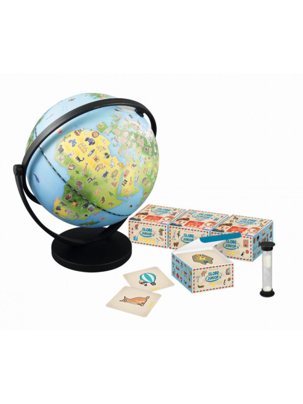 Wyjątkowy ilustrowany globus dla dzieci ciekawych świata! Mapa świata pokryta jest około 300 rysunkami: zwierząt, zabytków, dań kuchni różnych krajów itp. W zestawie znajdują się karty z obrazkami i ciekawostkami na odwrocie (Uwaga: informacje na odwrocie nie są dostępne w języku polskim. Dostępne języki: angielski, francuski, niemiecki, holenderski, włoski i hiszpański). Celem zabawy jest wylosowanie karty z obrazkiem i odnalezienie go na mapie świata. Zadanie należy wykonać w ograniczonym czasie, wyznaczonym przez klepsydrę. Po prawidłowym wskazaniu, gracz zdobywa wybraną kartę i może spróbować jeszcze raz. Po upływie czasu, kolejka przechodzi na następną osobę. Wygrywa gracz, kóry jako pierwszy zdobędzie 20 kart. Zawartość:- 1 globus o średnicy 20 cm,- 300 dwustronnych kart,- 1 klepsydra,- instrukcja Wiek: 4+ Wymiary: 21 x 21 x 28 cm