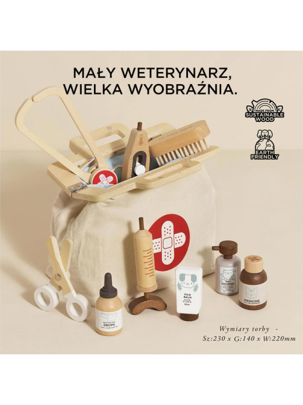Składa się z torby w stylu vintage wykonanej z naturalnej tkaniny z uchwytami do przenoszenia, która zawiera 9 drewnianych akcesoriów do zabawy z unikalnymi cechami do odkrycia, w tym: łagodzący balsam do łap, krople do uszu, buteleczka z lekarstwem, szampon dla zwierząt, stetoskop, nożyczki opatrunkowe, strzykawka, termometr i miękką szczotka z ekologicznym włosiem. Wszystkie akcesoria zostały wykonane z drewna pochodzącego ze zrównoważonych zasobów z certyfikatem FSC.