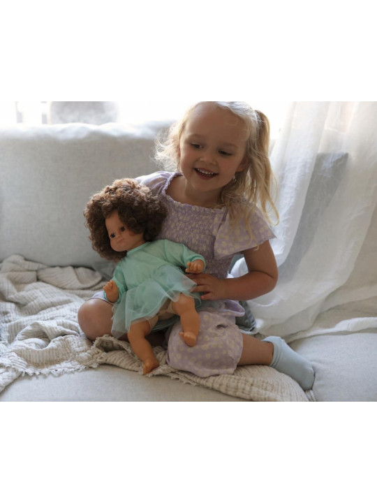 Urocza lalka w przepięknej błyszczącej tiulowej sukience ma brązowe kręcone włosy i właśnie poznaje świat. Chętnie odgrywa role i uczy emocji, a także pomaga poznać nowe słowa w obcym języku, np. angielskim.